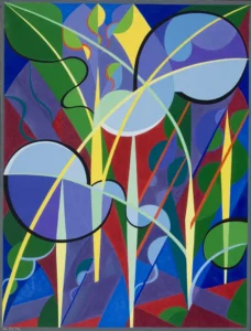 Groeikracht is de titel van dit bijzondere schilderij. Het werk lijkt geïnspireerd door De Stijl, maar de Blaricumse kunstenaar Lou Loeber (1894–1983) wilde niet zo ver gaan als tijdgenoten Piet Mondriaan en Bart van der Leck. In haar kunst moest altijd iets herkenbaars blijven. In Groeikracht is de natuur de inspiratiebron: stengels en bladeren groeien omhoog en in de primaire kleuren lijkt zelfs zonlicht door te schemeren.